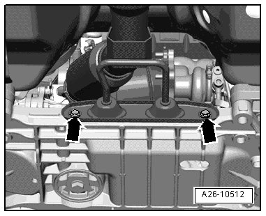 - From above, remove the nuts - arrows - on the front exhaust pipe connection to the turbocharger.