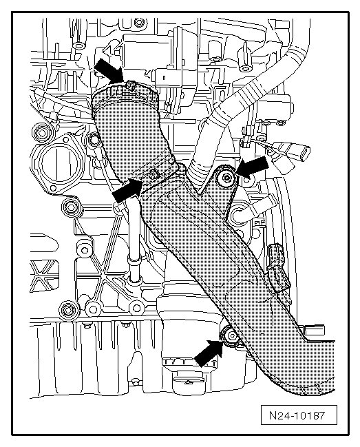 - Loosen the screw-type clamps - upper arrows -, remove the screws - lower arrows - and remove the charge air pipe and hose downward.