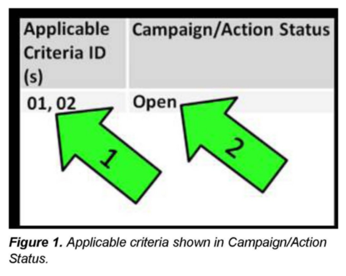 Applicable Criteria ID(s) (Figure 1, arrow 1) and "Open" (Figure 1, arrow 2) is shown in Campaign/Action Status under the Campaigns/Actions tab in