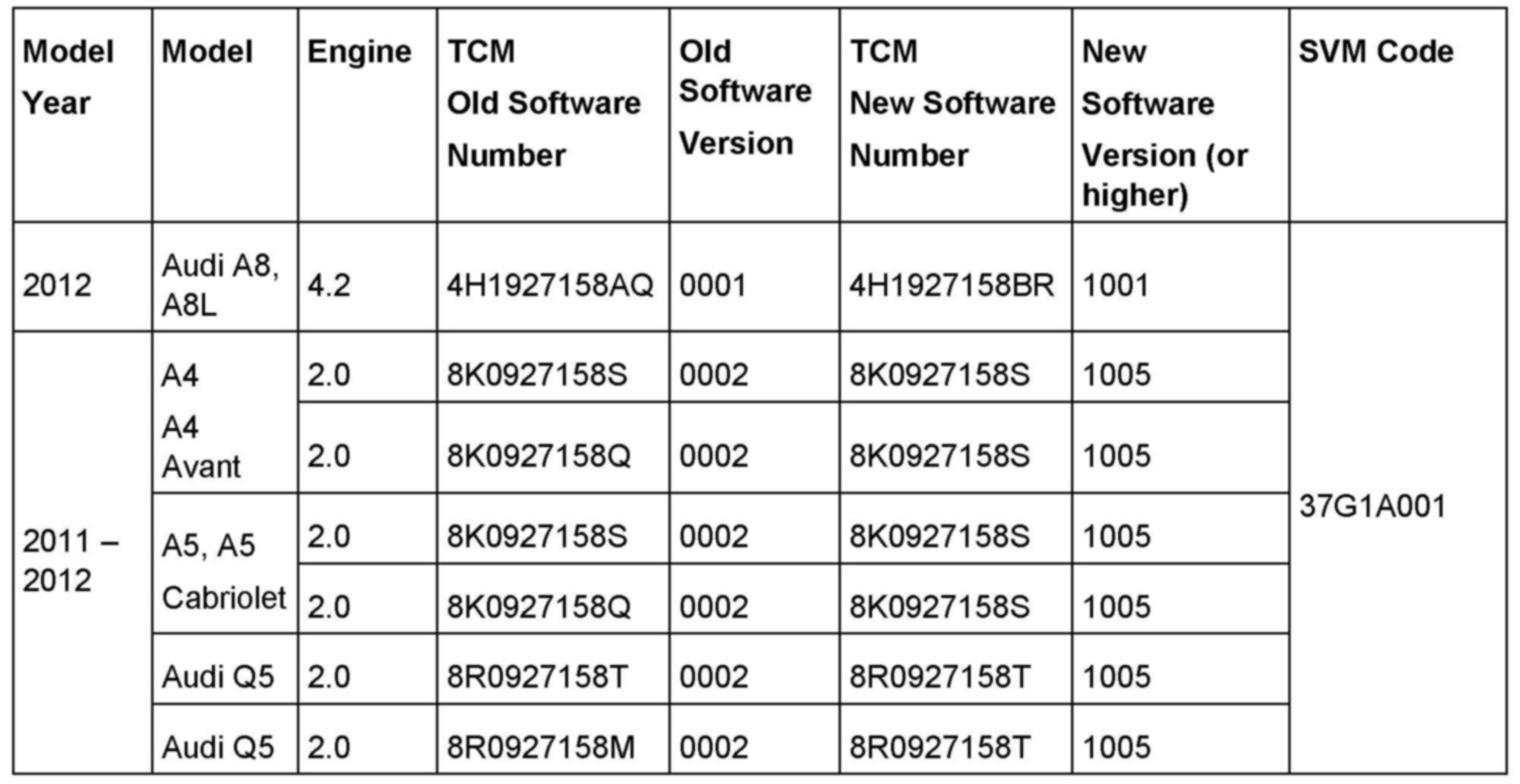 For the 2011 A4, A5, A5 Cabriolet and Q5 vehicles, this adaptation is only for vehicles with 2011 ECM software level and TCM software that changes TCM software suffix. TCM software suffix that change (i.e. ***Q 0002 to ***S 1005) will clear the adaptation. Other ECM software versions are not affected by this Applicable Criteria ID. Do not attempt to update vehicles not shown as affected in ElsaWeb.