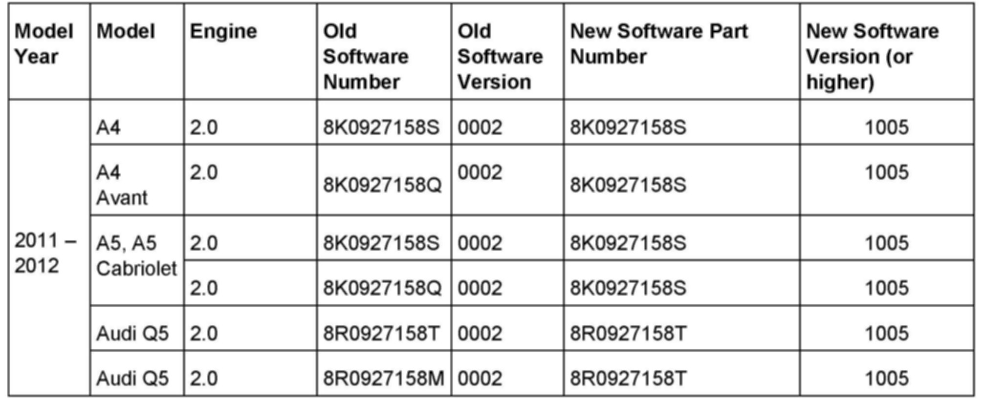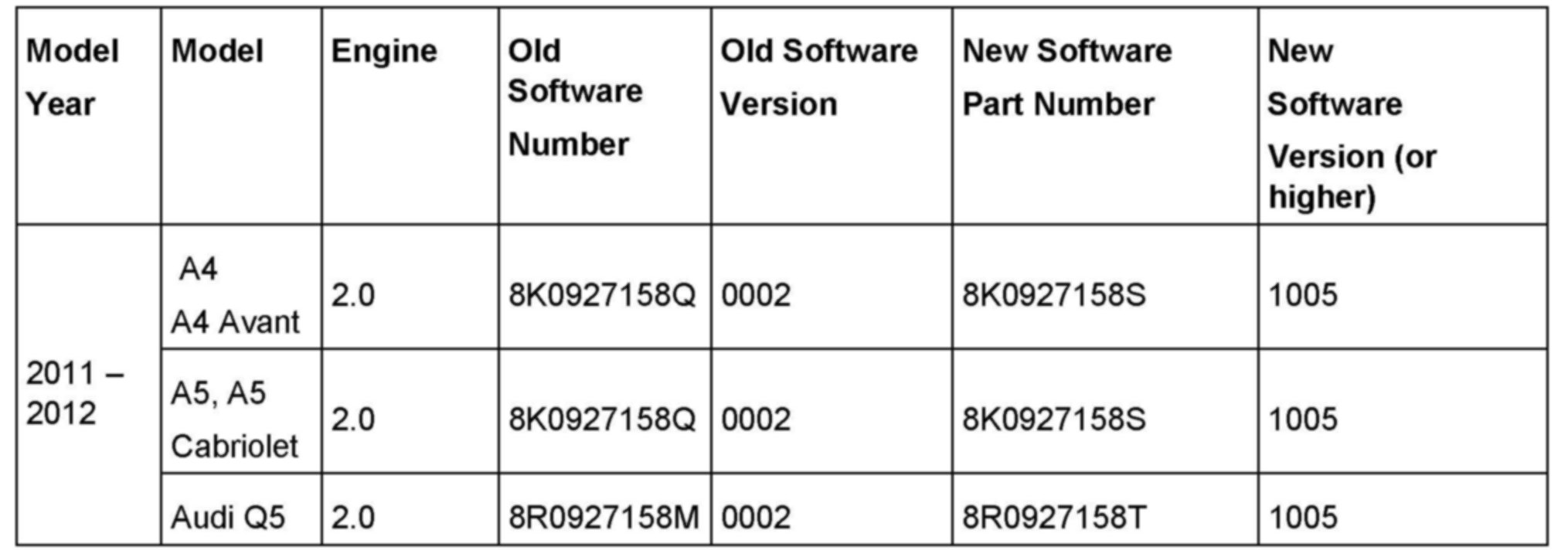 For the 2011 or 2012 A4, A5, A5 Cabriolet, and Q5 vehicles, this update is for vehicles with 2012 ECM software. Other ECM software versions are not affected by this Applicable Criteria ID. Do not attempt to adapt vehicles not shown as affected in ElsaWeb.