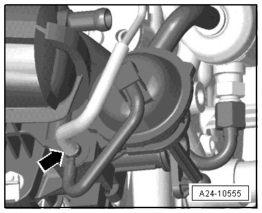 - Disconnect the vacuum line - arrow - to the Evaporative Emission (EVAP) canister.