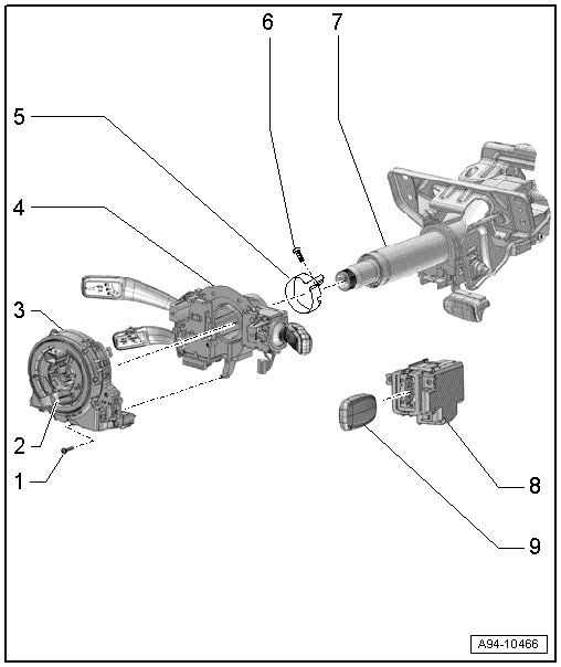The steering column switch module consists of the coil connector with slip ring, steering angle sensor (G85) , steering column switch (turn signal indicator switch, wiper switch, cruise control switch) and steering column electronic systems control module.