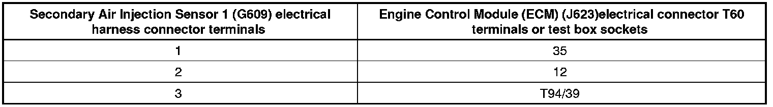 - Using a multimeter, check the Secondary Air Injection Sensor 1 (G609) electrical harness connector terminals to Engine Control Module (ECM) (J623) electrical harness connector T60 terminals.
