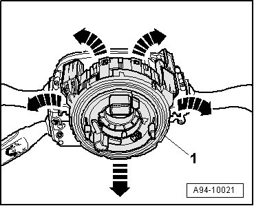 - Carefully release fasteners - arrows - and pull airbag spiral spring/return spring with slip ring - 1 - off steering column switch module.