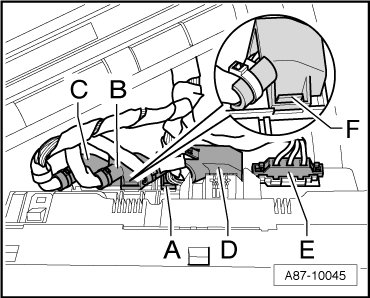 • The Climatronic Control Module (J255) A/C control head is not always connected to terminal "15", therefore after voltage supply interruption (via connector - D -) wait at least 30 seconds to protect the electronics until the remaining connections are disconnected.