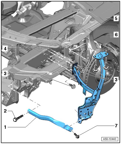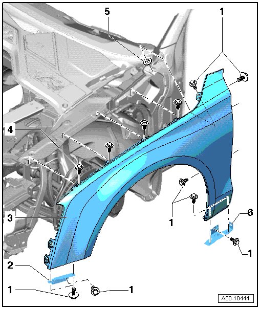 • Remove the bolts - 3 - from the longitudinal member, - 6 - from the fender flange - 7 - and from the front fender bracket.