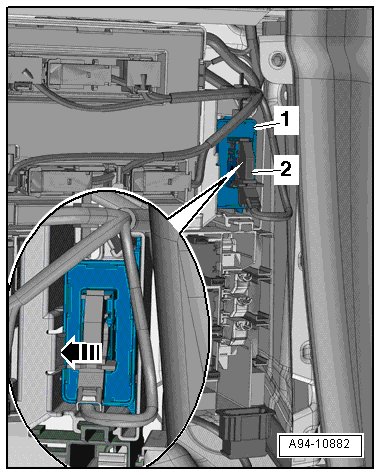 - To disconnect electrical connector, press catch - 1 -, turn retaining bracket in - direction of arrow - and remove connector.