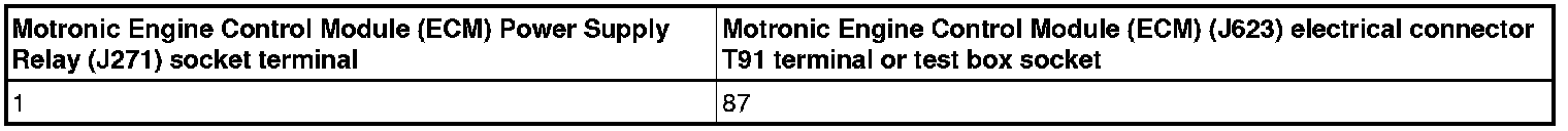 - Using a multimeter, check the Motronic Engine Control Module (ECM) Power Supply Relay (J271) socket 1/30 to Ground (GND).