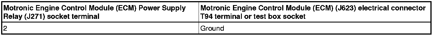 - Using a multimeter, check the Motronic Engine Control Module (ECM) Power Supply Relay (J271) socket 2 to Ground (GND).
