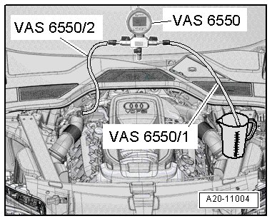 - Connect the (VAS 6550) to the fuel supply line using (VAS 6550/2).