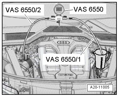 • In order to measure the fuel delivery rate, there must be an initial pressure inside the fuel line against which the fuel pump must work during the measuring. Adjust the initial pressure using (VAS 6550) as follows: