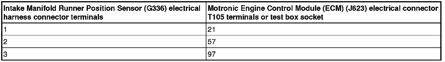 - Using a multimeter, check the Intake Manifold Runner Position Sensor (G336) electrical harness connector terminals to the Motronic Engine Control Module (ECM) (J623) electrical harness connector T105 terminals for an open circuit.