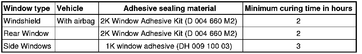 • For safety reasons, use only electrically non-conductive 2C-adhesive when installing windshield and rear window using the materials listed below.