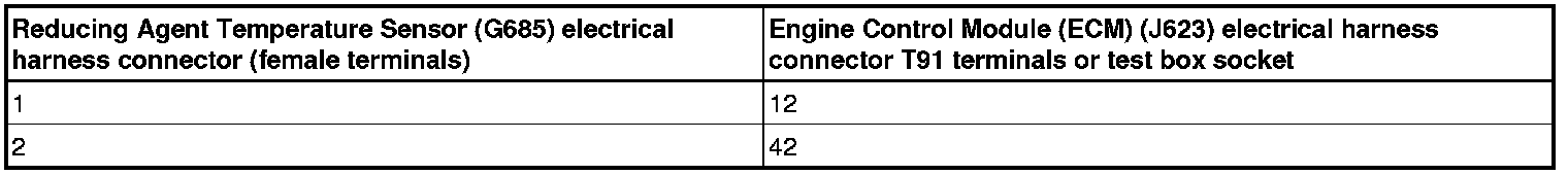 - Using a multimeter, check the Reducing Agent Temperature Sensor (G685) electrical harness connector to the Engine Control Module (ECM) (J623) electrical harness T91 connector for resistance.