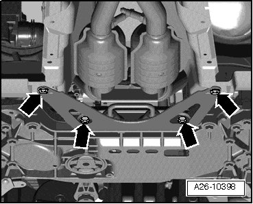 - Remove exhaust system bracket bolts - arrows -.