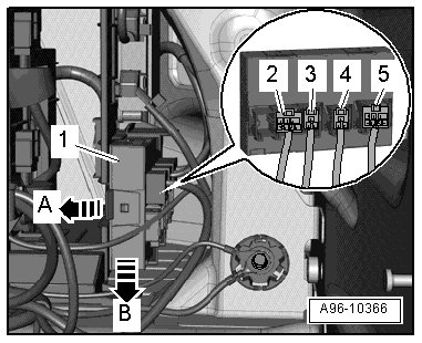 - Press retaining clip to side - arrow A - and remove Comfort System Central Control Module - item 1 - from control module bracket - arrow B -.