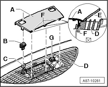• First carefully loosen retainers - F - from defroster vent - D - with a small screwdriver - E -. Do not damage surface of cover - A - or defroster vent - D - when doing so.