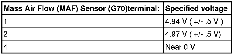 - Using a multimeter, connect black lead to ground and red lead to terminal 1, 2 and 4 of the MAF connector and check for voltage using the chart below.