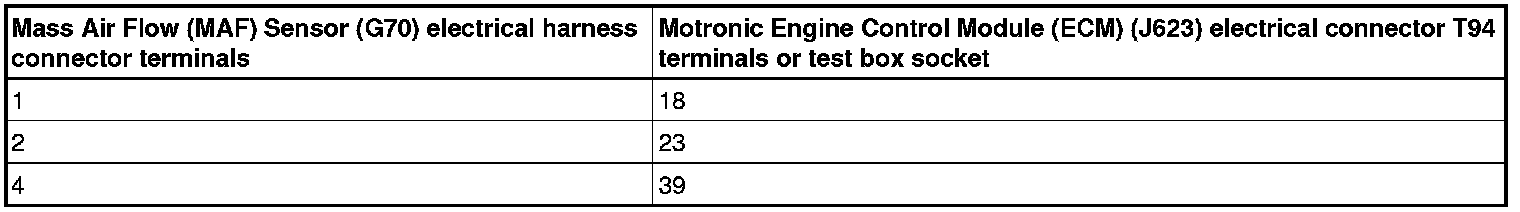 - Using a multimeter, check the Mass Air Flow (MAF) Sensor (G70) electrical harness connector terminals to the Motronic Engine Control Module (ECM) (J623) electrical harness connector T94 terminals for an open circuit.