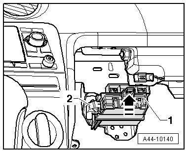 - Press the locking mechanism - arrow - upward and pull the tire pressure monitoring system control module - 1 - out of the retainer slightly.