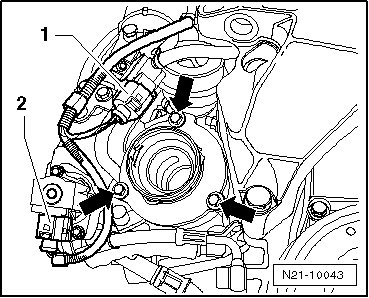 - Disconnect the Turbocharger Recirculating Valve (N249) electrical harness connector- 2 -.