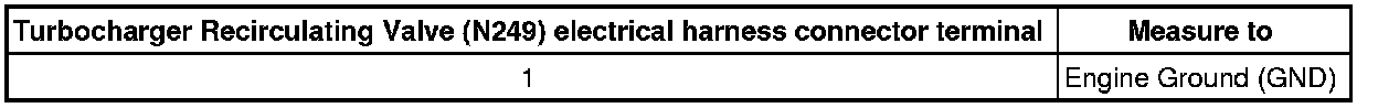 - Using a multimeter, check the Turbocharger Recirculating Valve (N249) electrical harness connector terminal 1 to Ground (GND).
