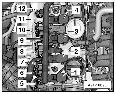 • For Knock Sensor 1 -G61- . Intake Manifold Runner Control (IMRC) Valve -N316- , Fuel Pressure Sensor -G247- , Intake Manifold Runner Position Sensor -G336- , Engine Coolant Temperature (ECT) Sensor -G62- , Camshaft Position (CMP) Sensor -G40- , and Fuel Injectors -N30- to -N33-