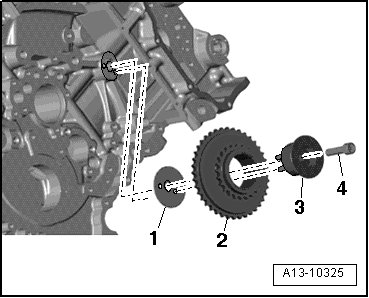 • The alignment bushings in the right camshaft timing chain drive sprocket mounting pins - 3 - must engage in the holes in the thrust washer - 1 - and cylinder block.