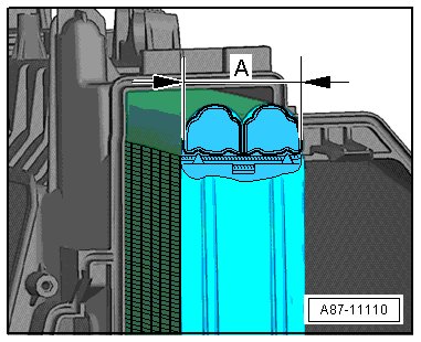 • From the start of production through the change-over from MY 12, evaporators approximately 40 mm (1.6 in.) wide (block depth) - A - are being installed (air conditioner part number "8K_ 820 005"). From MY 12, as a running change and depending on the version of the vehicle, an approximately 50 mm (2 in.) wide evaporator (block depth) - A - is being installed (air conditioner part number "8T_ 820 005"). Pay attention to the correct allocation of the evaporator expansion valve (there are different versions). Refer to the Parts Catalog.