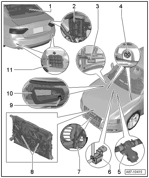 • The following illustration shows the location of the components on an Audi A5 Coupe; the Audi Q5 location of the components varies slightly. The description of the components is not different; removing and installing is performed in the same way as on the Audi A5 Coupe