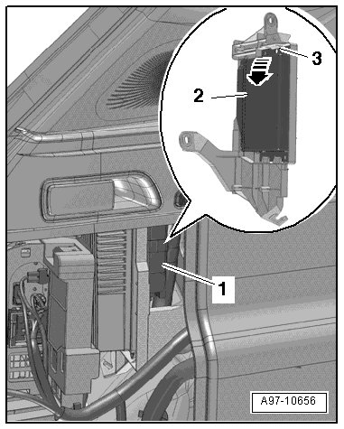 - Push the clip - 3 - upward and move the special purpose vehicle control module - 2 - in the direction of the - arrow - out of the frame.