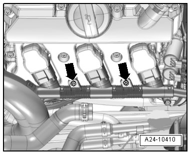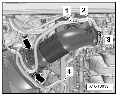 - For cylinder 2 and 3 ignition coils, remove the air guide hose (open the hose clamp - 3 - and the clips - arrows -).