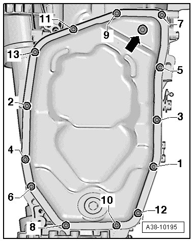 - Tighten the new ATF oil pan bolts in the following sequence: - 1 to 9 -.