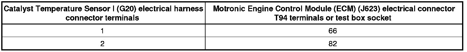 - Using a multimeter, check the Catalyst Temperature Sensor l (G20) electrical harness connector terminals to the Motronic Engine Control Module (ECM) (J623) electrical harness connector T94 terminals for an open circuit according to the wiring diagram.