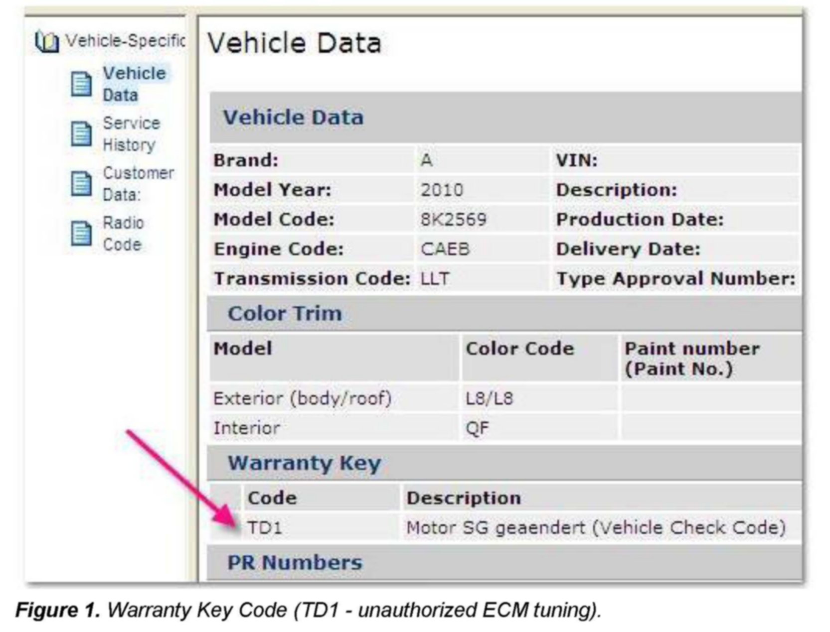 A Specified vs. Actual ECM Software comparison can be used to test for chip tuning on some modern Audi engines via the TD1 warranty key flag.