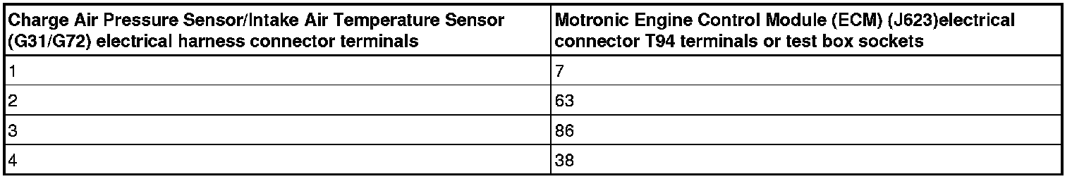 - Using a multimeter, check the Charge Air Pressure Sensor/Intake Air Temperature Sensor (G31/G72) electrical harness connector terminals to the Motronic Engine Control Module (ECM) (J623)electrical harness connector T94 terminals for an open circuit according to wiring diagram.