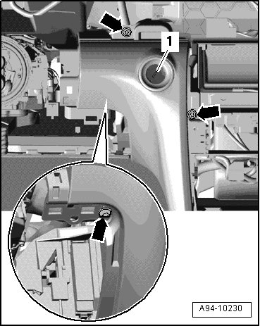 - Remove screws - arrows - and remove Access/Start Authorization Switch - item 1 - back from instrument panel.