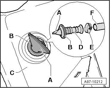 - Slide condensation water drain - B - into vehicle interior from below (disengage condensation water drain - B - from rear floor plate - C - to do so).