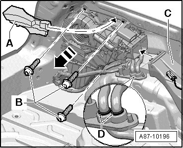 - Disengage heating & A/C unit from air guide - C -, pull heating & A/C unit slightly toward rear and then tilt it carefully toward the right to do this.