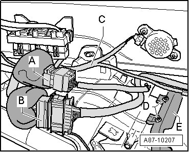 - Disconnect electrical connections - A - and - B - and secure the loose connectors to vehicle for example, with adhesive tape so that they do not interfere with removal of heating & A/C unit.