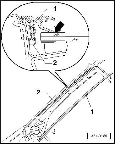 - When pressing in drip rail, make sure sealing lip - arrow - lies flat against windshield and does not slip behind edge of windshield.