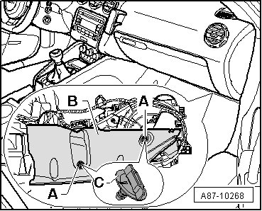 • With ignition switched on and Fresh Air Blower (V2) actuated, fresh air blower control module connects "Positive" from terminal 4 of connector - C - to terminal 1 of connector - B -. Fresh Air Blower speed is regulated by fresh air blower control module via the ground connection between terminal 2 connector - B - and terminal 3 of connector - C -. Check using Vehicle diagnosis, testing and information system (VAS5051B) in the "Guided Fault Finding" function and.