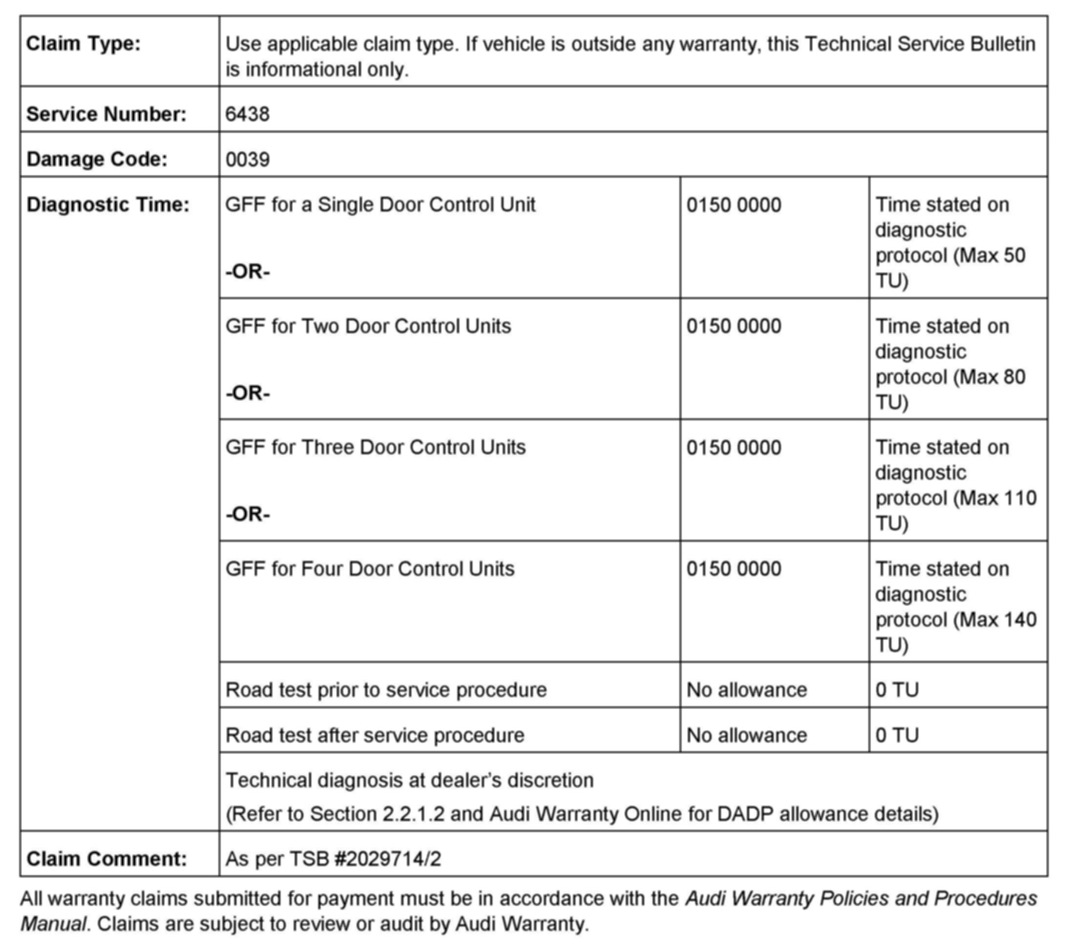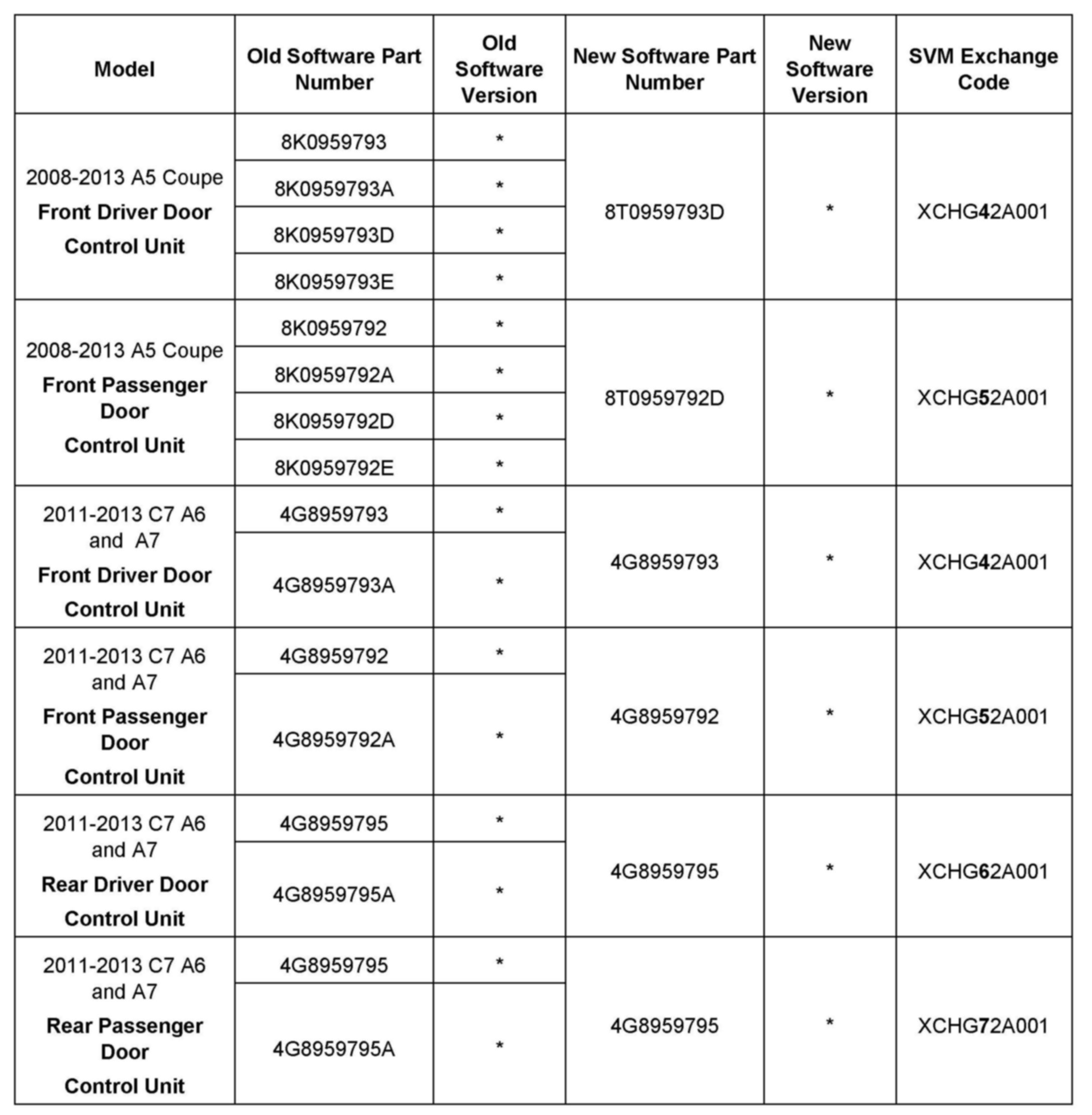 The C7 rear door control units have the same hardware/software part numbers for left and right sides (and can be installed on either side), but there are different SVM codes for rear left and rear right! No software update is performed during this SVM communication.