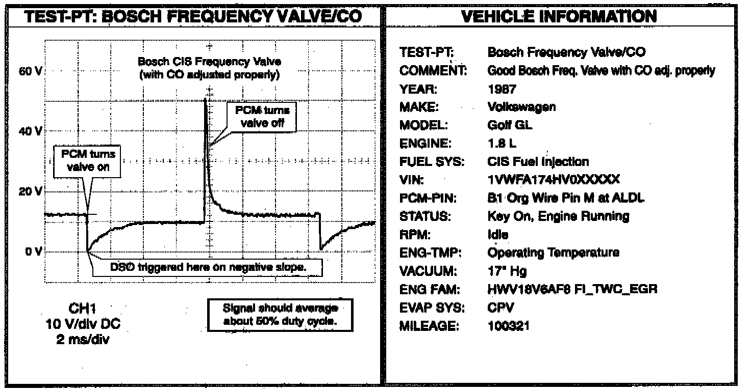 All Bosch CIS frequency valve waveforms look and operate like the one in this example, except Mercedes Benz frequency valves, which have a different driver, and thus waveform, but operate in exactly the same way.