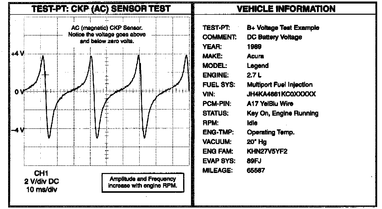 IMPORTANT NOTE: Beware that peak voltages, as well as the shape of the waveform, will vary substantially from one type of sensor to the next. Also, since an integral part of the sensor is a coil, or winding, their failures can be very temperature dependent. In most of these cases the waveform will become much smaller or very deformed, and the engine will stall, misfire or cut out at the same time the waveform takes on new shape. In general, the most common type of AC sensor failure is where the sensor won't generate a signal at all -- it's inoperative. It's boring to look at, but if the waveform stays flat while cranking the engine, make sure the circuit isn't grounded, check the DSO and sensor connections, make sure the proper parts are spinning, then condemn the sensor.