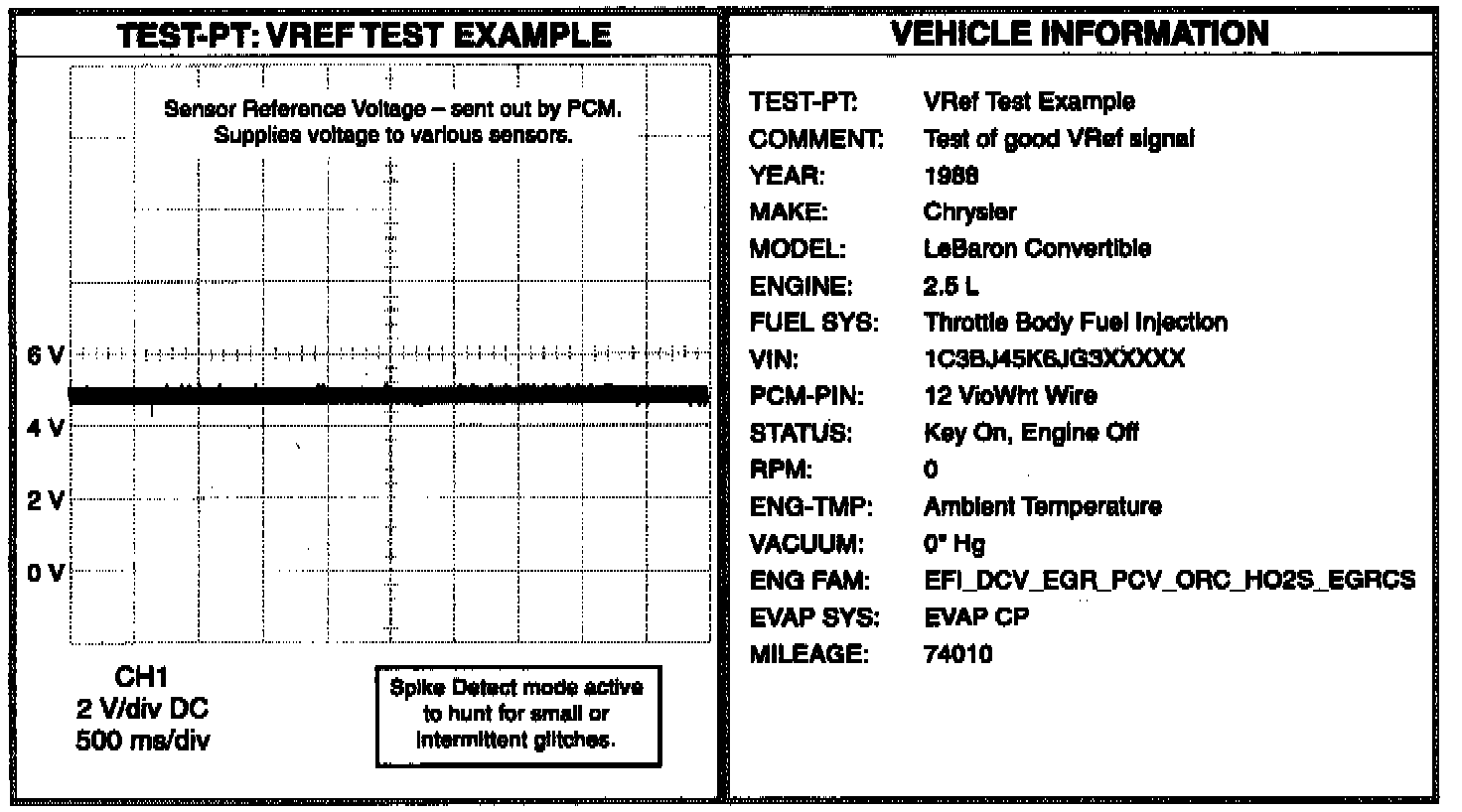 This DSO setup and test procedure can be applied to most all VRef circuits on 1980-and-up Electronic Powertrain Management systems. This setup and test procedure verifies that the sensors using the VRef signal as their power source are getting the quality of power they need to operate properly. Many Manifold Absolute Pressure (MAP), Throttle Position Sensor (TPS), Engine Coolant Temperature (ECT), Intake Air Temperature (IAT) and other sensors and circuits use a 5 volt VRef as their power source. The relatively slow time base of 500 ms (milliseconds) allows a glitch to stay on the screen for 5 long seconds, so the diagnostician can get a good look at what is happening. The DSO is set in SPIKE DETECT acquire mode so it's sampling the signal superfast, looking for small or intermittent glitches.