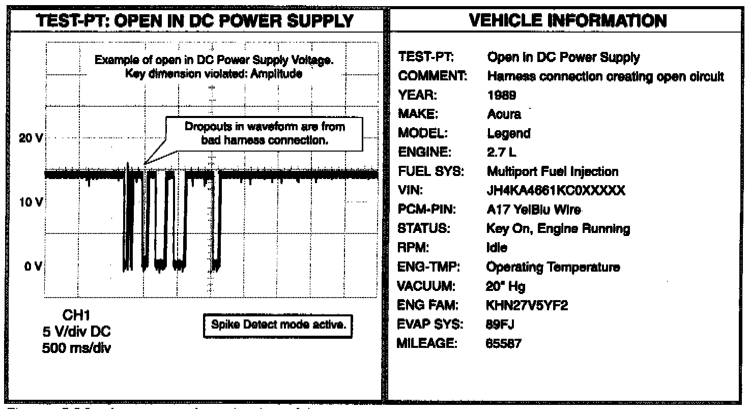 If the circuit under test is a B+ power supply, the waveform's amplitude should not change with respect to time. If the circuit under test is a switch or other operational device, then the waveform's amplitude should only change if the switch or device is being operated. Possible violations of the "Critical Dimension" rule to watch for are spikes to ground, as in the above example (meaning there is an open circuit in the power side, or a voltage short to ground), upward spikes (meaning possible open in ground side), or out of range voltage (either too low or too high).