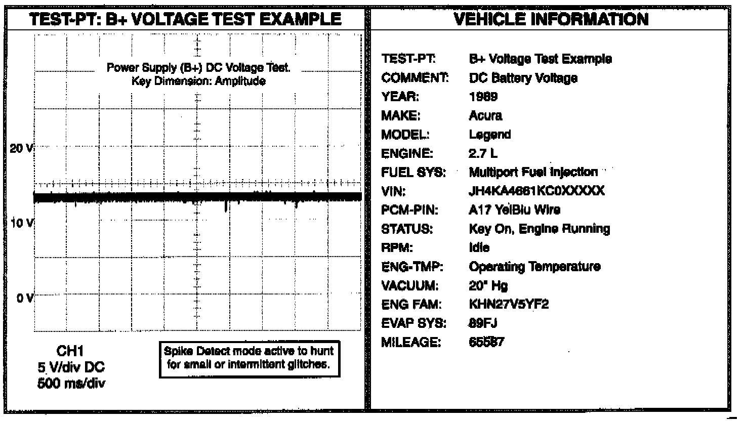 BACKGROUND AND APPLICATION INFORMATION:This same Digital Storage Oscilloscope (DSO) setup and test procedure can be applied to a lot of different automotive circuits that use B+, or battery voltage as their power source, such as power supply circuits (to the Powertrain Control Module (PCM) and other control modules, such as cruise control, Antilock Brake System, climate control, etc.), temperature switches, throttle switches, vacuum switches, light switches, brake switches, cruise control switches, etc. The relatively slow time base of 500 ms (milliseconds) allows a glitch to stay on the screen for 5 long seconds, so the diagnostician can get a good long look at what is occuring in the circuit. The DSO is set in "SPIKE DETECT" acquire mode so it's sampling the signal at warp speed -- about once every 40 billionths of a second. At 500 ms/div however, the DSO displays the information slowly, so the diagnostician has plenty of time to interpret it.