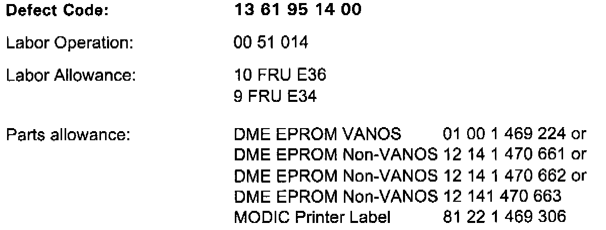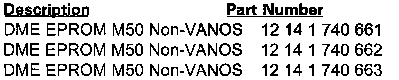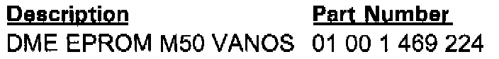 VANOS vehicles for which Service Action 130 is complete or is not applicable the DME EPROM must be replaced. Part Number 1707984 is compatible wit Part Number 01 00 1 469 224 and can be used on VANOS vehicles with an without EWSII.